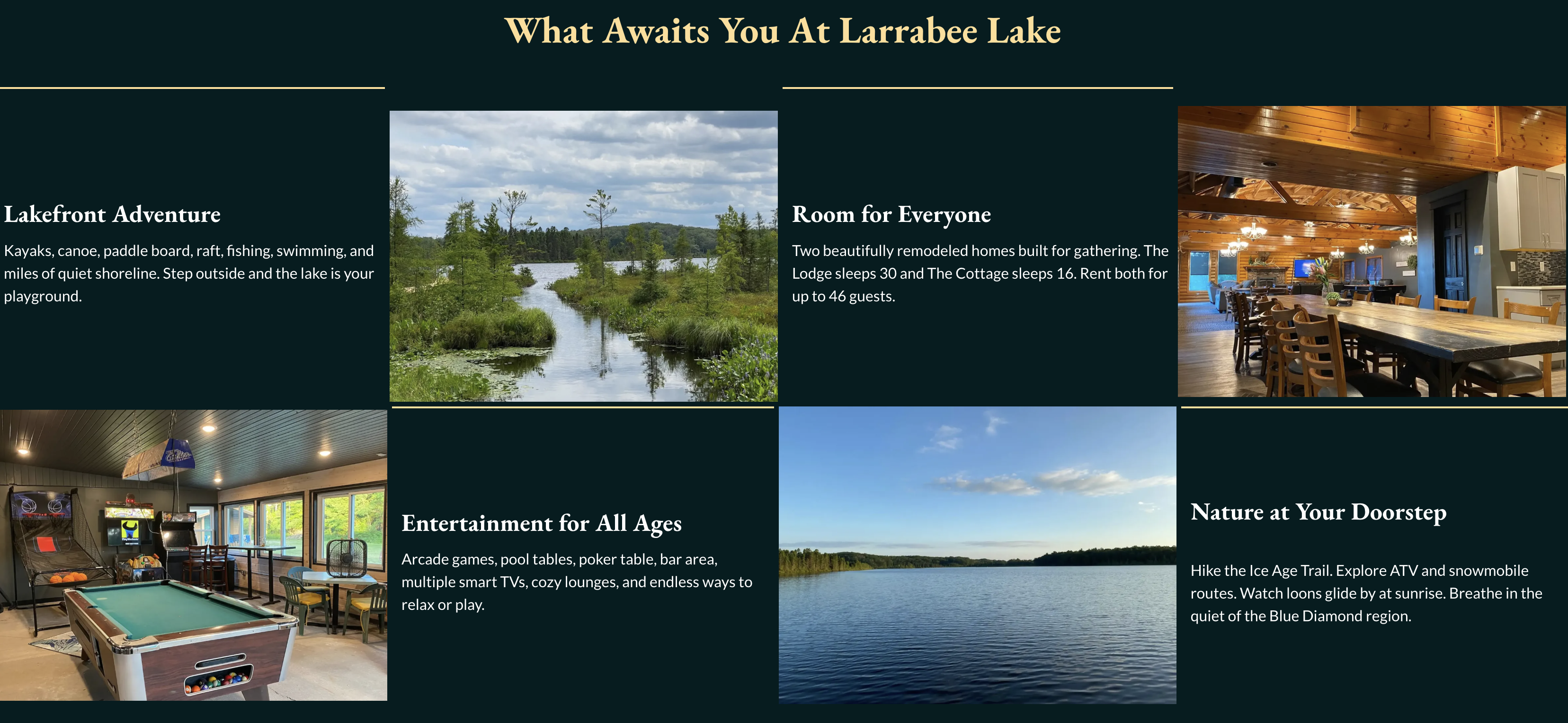 Select your dates to explore availability for both the Lodge and the Cottage, or reserve them both for groups of up to 46 guests. Your lakeside adventure awaits!